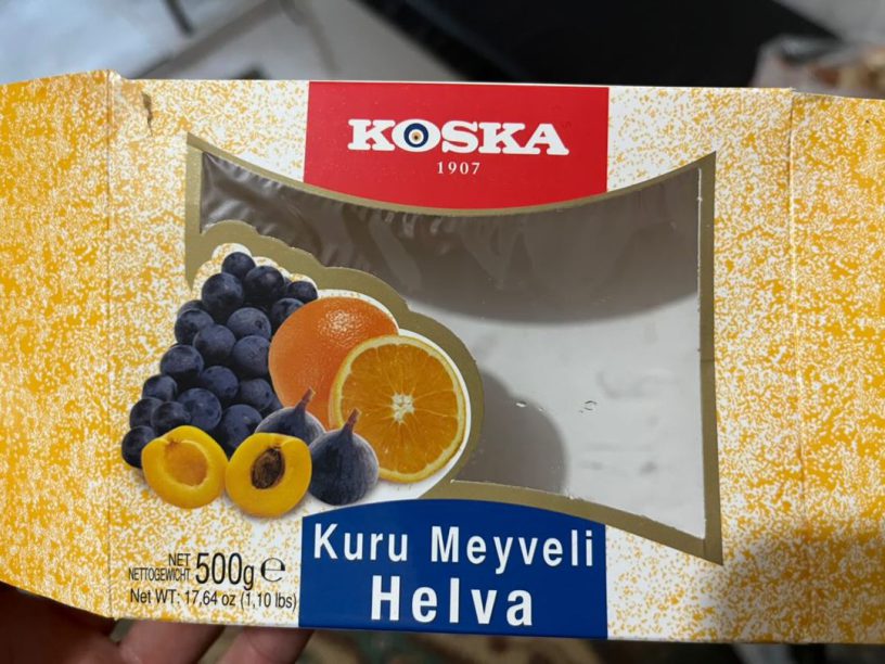 Daha önce kabuklu susamdan tahin ve kremalı tahin pekmez ürünlerini incelediğimiz Koska markasının bu sefer kuru meyveli yaz helvasını inceleyeceğiz. Ürün bir takipçimiz tarafından içeriğindeki yeşil parçacıklar sebebiyle firmayla yaptığı yazışmaya istinaden gönderildi. Firma ile yaptığı yazışma sonrasında takipçimize söz konusu parçacıkların içerik beyanında yer almayan “incir şekerlemesi” olduğu bilgisi verilmiş. Ürün 500 gr.’lık paketlerde satılıyor. Ürün ambalajı üzerinde üzüm, kayısı, incir ve portakal görselleri yer alırken, üründe bunların kuru meyve çeşitleri yer alıyor.