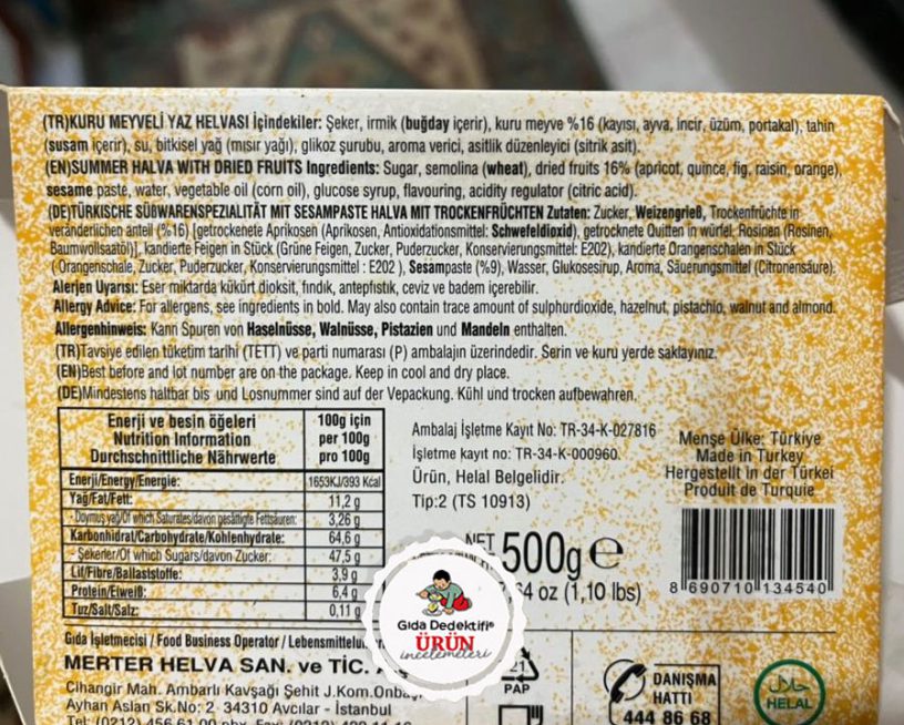 🔎İçindekiler; Şeker, İrmik, Kuru meyve (%16) [Kayısı, Ayva, İncir, Üzüm, Portakal], Tahin, Su, Bitkisel yağ (Mısır), Glikoz şurubu, Aroma verici, Asitlik Düzenleyici (Sitrik asit)