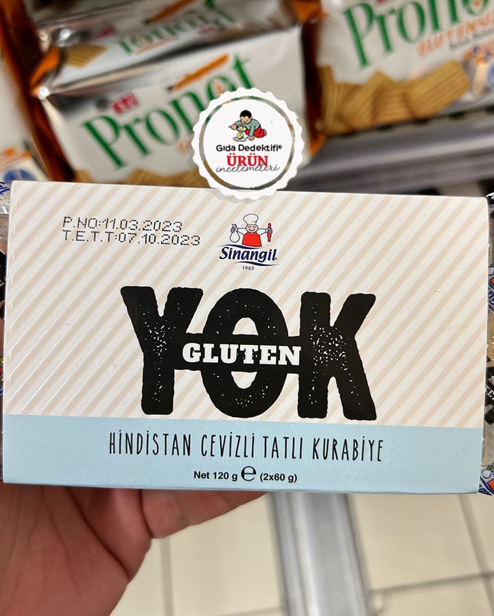 Marketlerde görmeye başladığımız ve ürün çeşitliliği de gün geçtikçe artma eğiliminde olan glutensiz ürün reyonlarından bir ürünü inceleyeceğiz; Sinangil Gluten Yok Hindistan Cevizli Tatlı Kurabiye. Ürün 60 gr’lık iki adet kurabiye içeren 120 gr’lık paketlerde satılıyor. Ürün ambalajında “Gluten Yok” ibaresi özellikle dikkat çekiyor. Ürünün etiket bilgileri çerçevesinde Sinangil markası sahibi Eksun Gıda tarafından değil, Aslı Börek markasıyla bilinen Atılım Unlu Mamüller San. ve Ticaret Ltd. Şti. tarafından üretildiği anlaşılıyor.