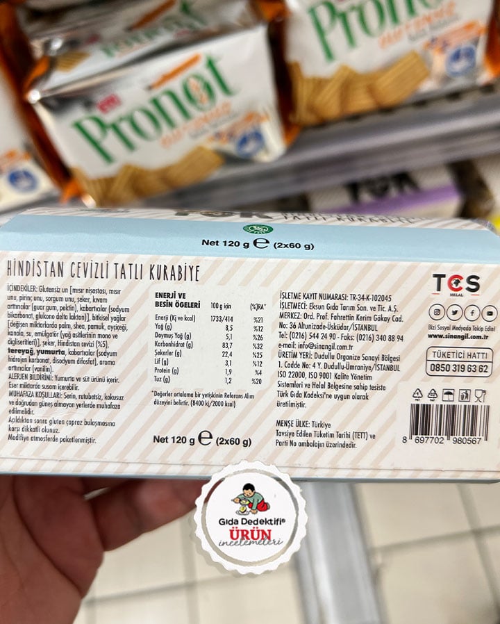 Üründe %5 oranında hindistan cevizi bulunurken, bu da 60 gr’lık tek kurabiyede 3 gr. hindistan cevizi demek oluyor. Üründe ayrıca bu haliyle 60 gr’lık tek adette 13,4 gr. şeker bulunuyor. Bu da tek adet kurabiyede yaklaşık 6 tane küp şeker bulunduğunu gösteriyor. Üründe bunun yanında 5,1 gr yağ ve 1,1 gr protein olduğunu görüyoruz. Üründe gluten bulunmadığı için protein kaynağı olarak hindistan cevizi ve kısmen tereyağı ile yumurta sayılabilir. Üründe bu haliyle tek porsiyondan alınan 248 kcal enerjinin %80’i karbonhidrattan gelirken, üründe karbonhidrat ağırlıklı yoğun kalori yanında 1,9 gr lif bulunuyor. Üründe koruyucu veya renklendirici katkı maddeleri yer almazken, aroma verici olarak vanilin içerdiği görülüyor. #NeYediğiniziBilin