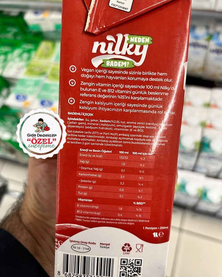 Vegan içeriğiyle hayvansal ürün tüketmek istemeyen tüketiciler tarafından tercih edilen ve dünyanın her yerinde olduğu gibi Türkiye’de de çeşitleri gittikçe artan badem sütü olarak bilinen bademli içeceklerden birini inceliyoruz; Nilky Bademli İçecek. Ürün Nilky Gıda adına Balıkesir’deki Gönenli Süt fabrikalarında fason olarak üretiliyor. 1 litrelik paketlerde satılan ürünün ambalajında bir şişeye doldurulmuş bademler dikkat çekiyor.