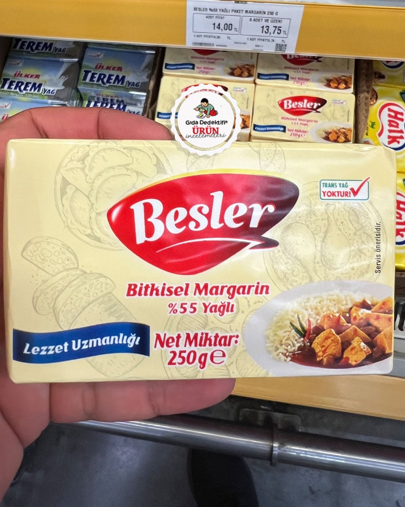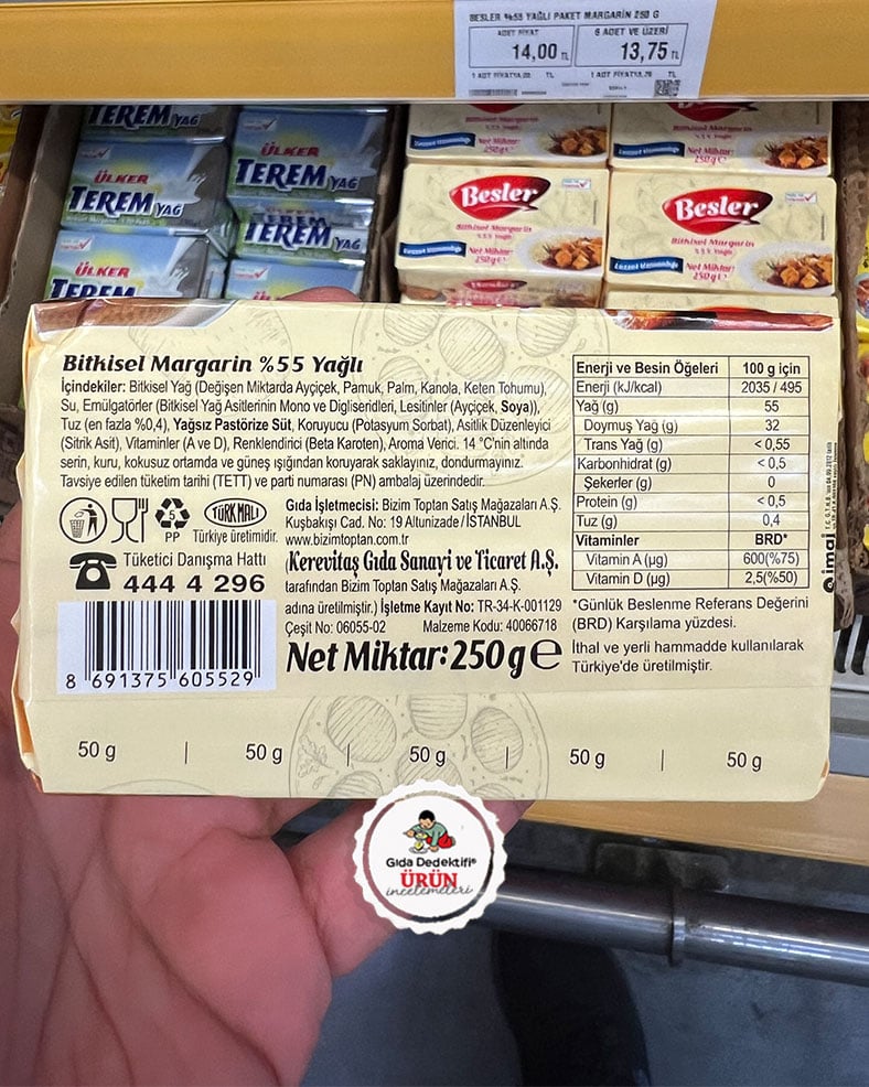 Türkiye’de margarin piyasasını neredeyse tek başına elinde tutan markalara sahip Yıldız Holding’e ait Kerevitaş Gıda tarafından üretilerek yine aynı holdinge sahip Bizim Toptan Market mağazalarında satışa sunulan Besler markalı %55 yağlı margarin ürününü inceleyeceğiz. Ürün 250 gr’lık paketlerde satışa sunuluyor ve tek porsiyonu 50 gr olarak kabul ediliyor. Ürün ambalajında “gıda mühendisliği ve aroma verici uzmanlığı” demek yerine, firmanın “lezzet uzmanlığı” şeklinde bir slogan kullandığı görülüyor. Ürün ambalajında ayrıca “trans yağ yoktur” ibaresi dikkat çekiyor.