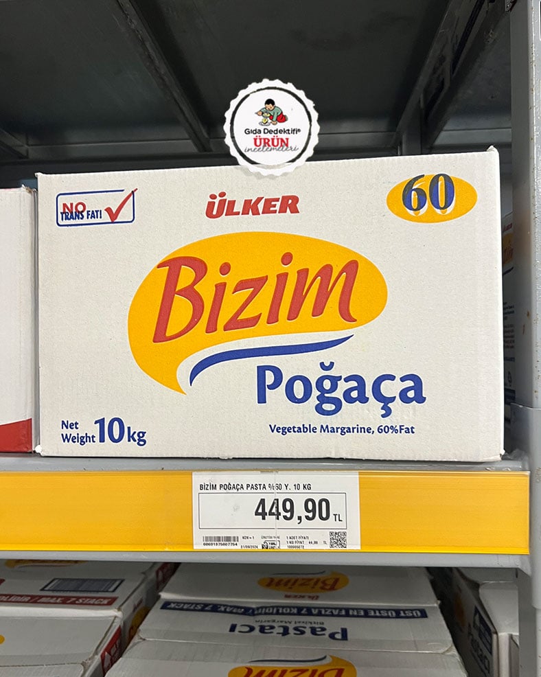 Belki de birçok kişinin yediği poğaçalarda hiç bilmeden tükettiği veya bazılarının ise tereyağlı sanarak yediği poğaçaların üretiminde kullanılan bir margarinden bahsedeceğiz. Yıldız Holding’e ait Bizim toptan marketlerde rastladığımız Ülker Bizim Poğaça Margarin 10 kg’lık ambalajalrda satılıyor. Birçok işletme bu ürünleri alarak poğaça ve benzeri hamur işleri üreterek bazen de “ev yapımı” diyerek tüketicilere satıyor. Sizin ise tükettiğiniz bu ürünlerin bu margarinlerle yapıldığından haberiniz bile olmuyor.