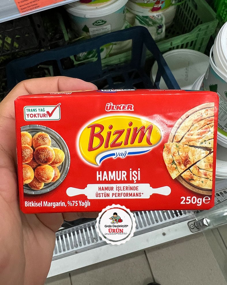 Yıldız Holding’e bağlı firmalar tarafından üretilerek satışa sunulan onlarca margarin markasından sadece biri olan ve Kerevitaş Gıda tarafından üretilerek satışa sunulan Ülker Bizim Yağ Hamurişi ürününü inceleyeceğiz. 250 gr’lık kalıp paketlerde satışa sunulan margarin ambalajında börek ve poğaça görsellerinin yanında “Hamur işlerinde üstün performans” ifadesi dikkat çekiyor. Bir motor yağı edasıyla ürün ambalajına konan sloganın sonundaki uyarıda “üstün performans” ifadesi “daha çıtır börekler, daha kabarık kekler, daha puf puf poğaçalar ve daha kıyır kıyır kurabiyeler için özel geliştirilmiş” ifadesi yer alıyor. Buraya kadar yazdıklarımız size şaka gibi gelebilir fakat değil. Bunların tamamı ürün ambalajında tüketicilere yapılan beyanlar arasında yer alan ifadelerdir.