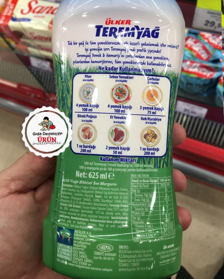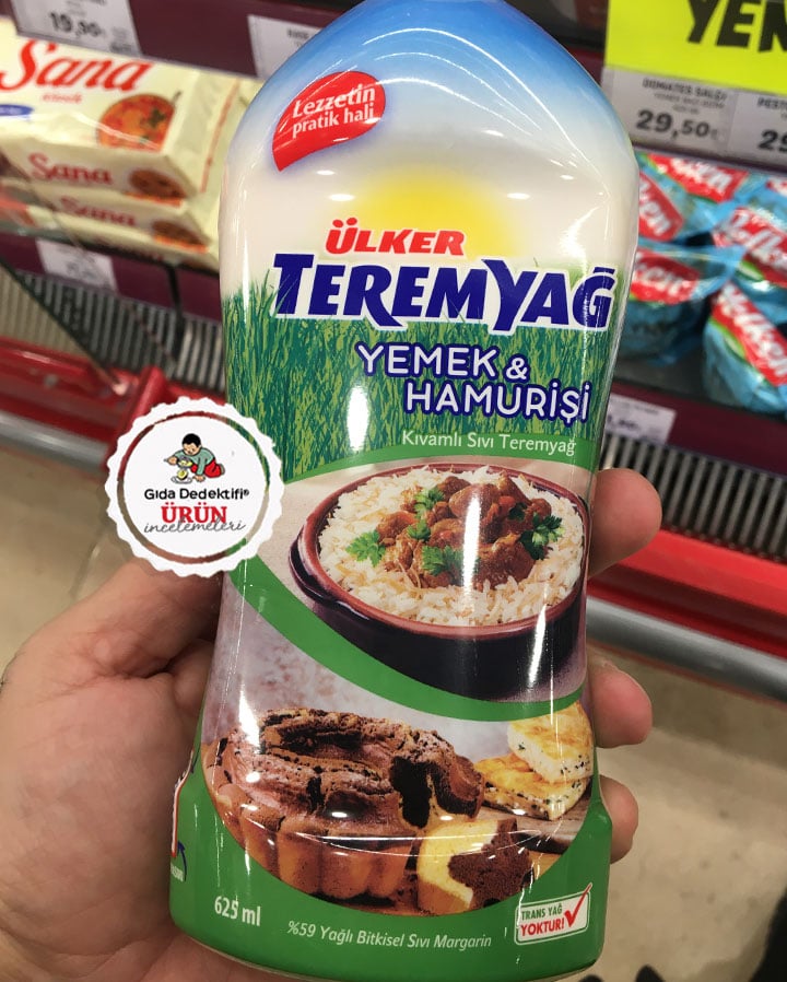 Uzun yıllardır raflarda olan ve son dönemlerde sıvı margarin formuyla da üretilmeye başlanan Ülker Teremyağ Yemek & Hamurişi Sıvı Margarin ürününü inceleyeceğiz. Ürün belki de ismiyle “tereyağ gibi” algı yaratan ilk ürün olarak da piyasaya sürülmüştü. Bugün “tereyağı keyfi” ismiyle yaygınlaşan bu ürünler margarin olmalarına rağmen, tereyağını çağrıştıran isim, slogan ve görsellerle satılmaya devam ediyor. Ülker Teremyağ Yemek&Hamurişi ambalajı üzerinde “Kıvamlı Sıvı Teremyağ” ifadesinin yanında yasal beyan olarak “%59 yağlı bitkisel sıvı margarin” ifadesini de içeriyor. Ürün 625 ml’lik şişelerde satılıyor.