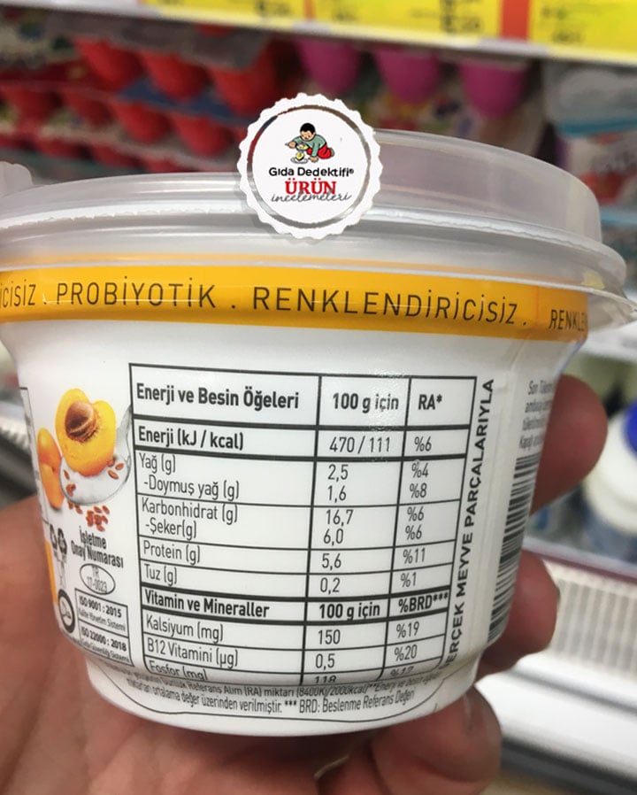 Üründe bunun yanı sıra kayısı ve keten tohumu sosu oranı da beyan edilmemiştir. Üründeki sos içeriğinde ise %7,5 oranında dondurulmuş kayısı ve %0,5 oranında keten tohumu yer aldığını anlamaktayız. Burada da sosun yüzde kaçının şeker olduğunu anlayamıyoruz. Öyle ki, sostaki şeker beyanı %0,5 oranlı keten tohumundan sonra yapılmaktadır bu da pek gerçeği yansıtmamaktadır. Üründeki sosta bunların yanı sıra kıvama arttırıcı ve limon suyu konsantresi bulunmaktadır. Ürün bu temel bileşenlerin yanı sıra süt proteini de içermektedir. Bu haliyle üründe sütten gelen protein yanı sıra ilave edilen süt proteini de yer almaktadır. Ürün buna göre 150 gr.’lık tek pakette 8,4 gr. protein içermektedir. Üründen alınan kalorinin %20’si proteinden gelmektedir. Üründe son sırada yoğurt kültürü ve kefir kültürü yer almaktadır. Firma beyanına göre ürün koruyucu, renklendirici ya da aroma verici herhangi bir bileşen içermemektedir. #NeYediğiniziBilin